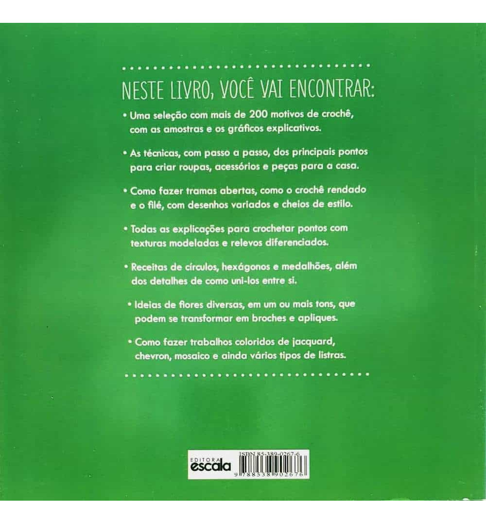 Uma publicação que apresenta uma seleção com mais de 200 motivos de crochê, com as amostras e os gráficos explicativos; As técnicas, com passo a passo, dos principais pontos para criar roupas, acessórios e peças para a casa; Como fazer tramas abertas, como o crochê rendado e o filé, com desenhos variados e cheios de estilo; Todas as explicações para crochetear pontos com texturas modeladas e relevos diferenciados; Receitas de círculos, hexágonos e medalhões, além de detalhes de como uni-los entre si; Ideias de flores diversas, em um ou mais tons, que podem ser transformar em broches e apliques; Como fazer trabalhos coloridos de jacquard, chevron, mosaico e ainda vários tipos de listras.