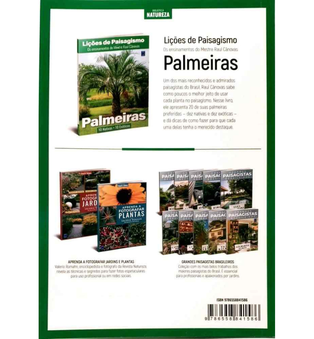 Etiquetas: Livros, Lições de Paisagismo, Palmeiras, Biblioteca Natureza, Planta, Paisagismo, Palmeiras Nativas, Açaí, Buriti, Butiá, Carandá, Cariota-de-espinho, Guiriri, Jerivá, Palmeirinha-de-Petrópolis, Palmito-juçara, Paxiúba, Palmeiras Exóticas, Carpentária, Palmeira-azul, Tamareira-do-rochedo, Palmeira-garrafa, Palmeira-leque-de-Fiji, Palmeira-moinho-de-vento, Palmeira-princesa, Palmeirinha-rabo-de-peixe, Pinanga, Washingtonia-de-saia, Natureza e Paisagismo, Livro das Palmeiras, História das Palmeiras, Livro das Plantas, História das Plantas, Livro de Paisagismo, História do Paisagismo, Editora Europa, Raul Cânovas