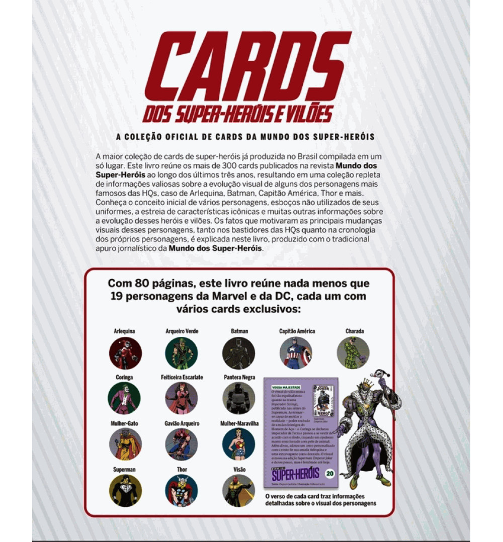 Uma publicação que apresenta os mais de 300 cards publicados na revista Mundo dos Super-Heróis ao longo de 36 edições, resultando em uma coleção repleta de informações valiosas sobre a evolução visual de alguns dos personagens mais famosos das HQs, caso de Arlequina, Batman, Capitão América, Thor e muito mais.