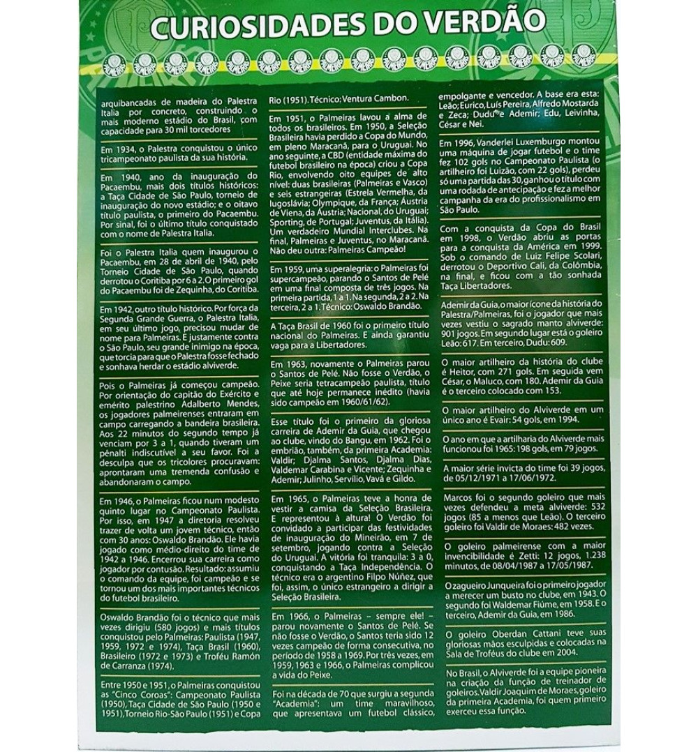 Uma publicação com mais de 125 adesivos com todos os escudos da historia palestrina, o mascote, camisa oficial, comemorativo à Libertadores, mini pôsteres com os principais esquadrões campeões, curiosidades dessa grande história.