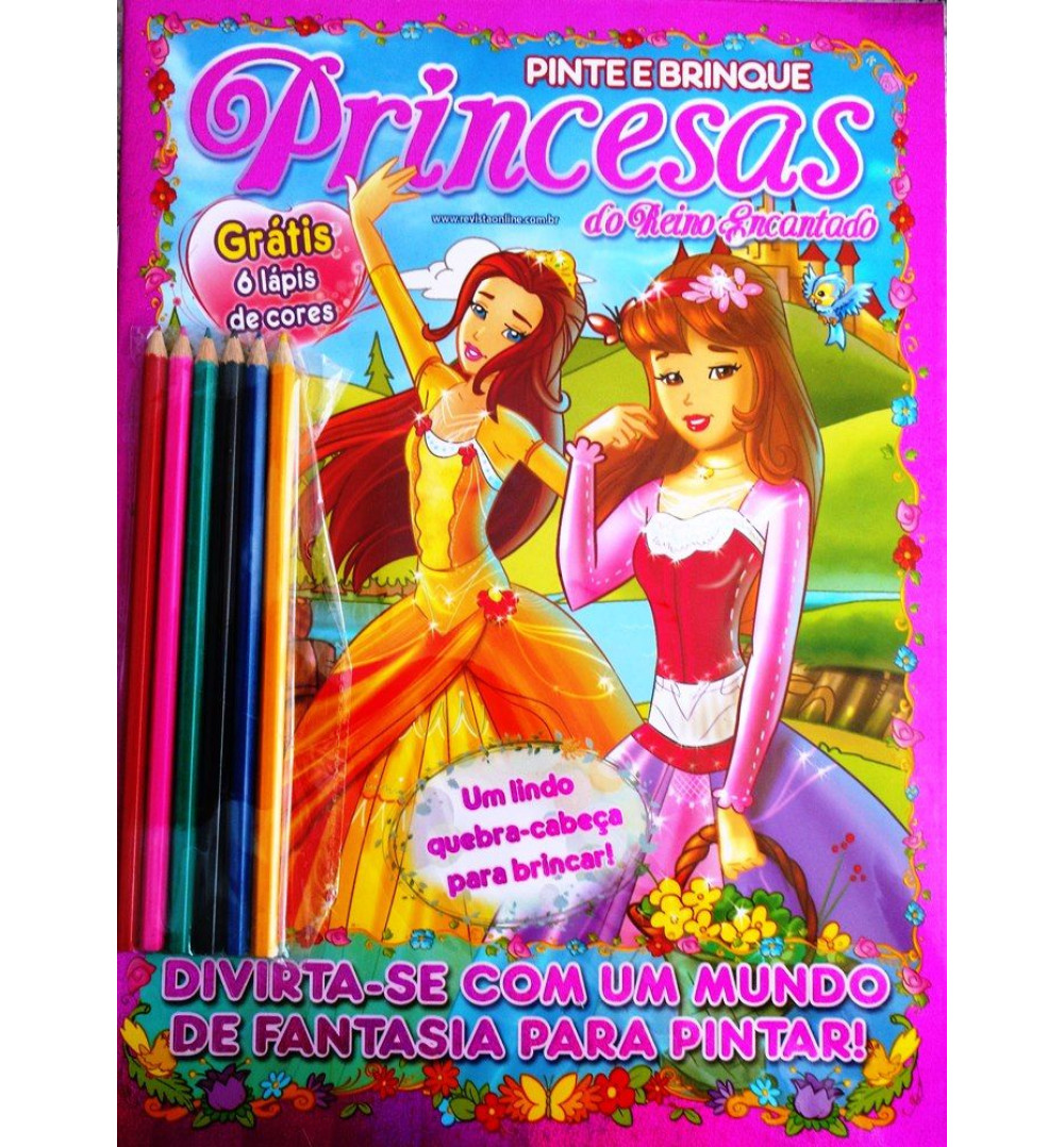 Revista Pinte e Brinque - Princesas do Reino Encantado - Grátis 6 Lápis de Cor, uma publicação para a criançada se divertir com um mundo de fantasia e pintar com os 6 lápis de cor que você leva grátis e mais, um lindo quebra cabeça para montar com os amigos e garantir a diversão.