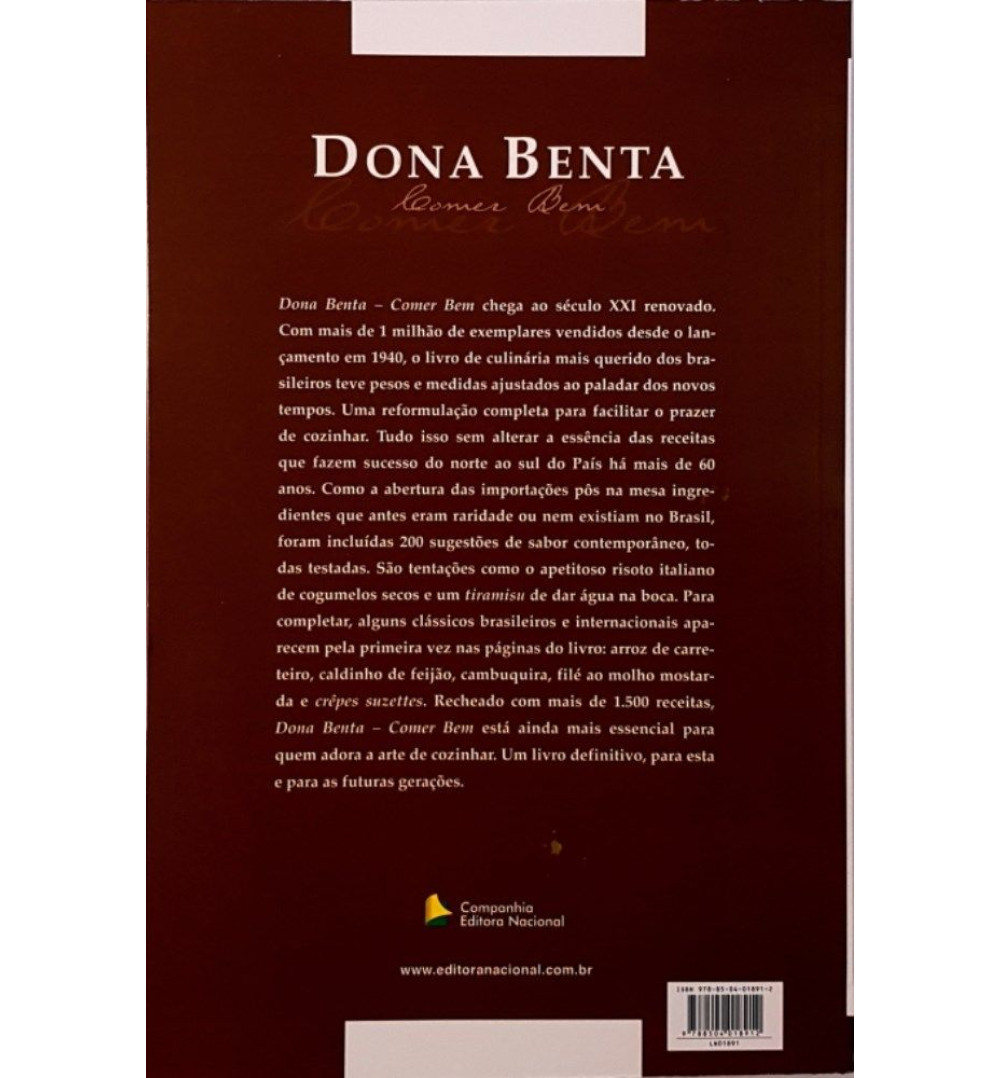 Livro Dona Benta Comer Bem - Edição Especial Completa, uma publicação que apresenta mais de 1500 receitas, verdadeiras tentações como o apetitoso risoto italiano de cogumelos secos e um tiramisu de dar água na boca. Para completar, alguns clássicos brasileiros e internacionais aparecem pela primeira vez nas páginas do livro: arroz de carreteiro, caldinho de feijão, cambuquira, filé ao molho mostarda e crepes suzettes. Tudo isso sem alterar a essência das receitas que fazem sucesso do norte ao sul do país há mais de 70 anos.