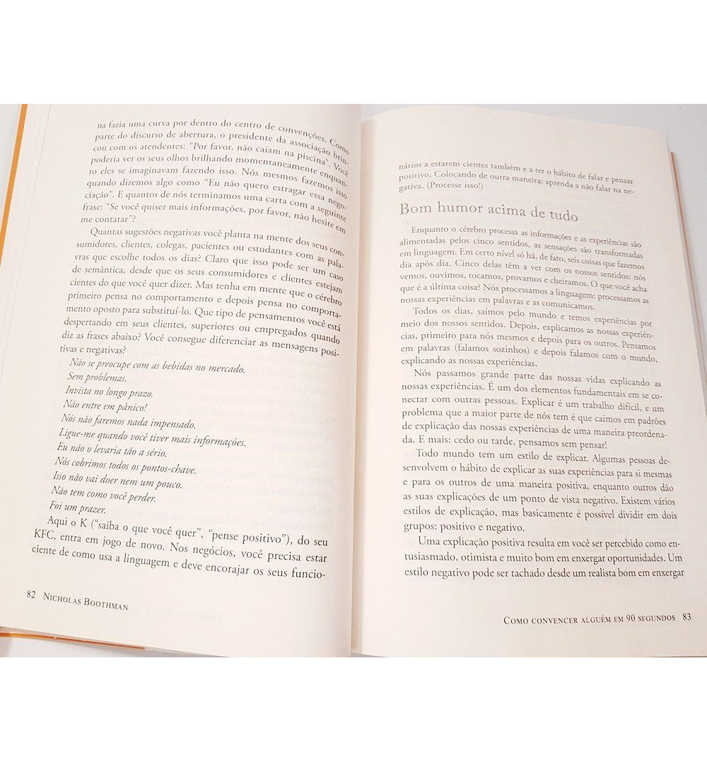 Livro Como convencer alguém em 90 segundos, uma publicação que apresenta a garantia de uma comunicação de sucesso, transformando as conexões instantâneas em duradouras e produtivas relações de negócios. Nesta obra, o especialista Nicholas Boothman ensina como usar o rosto, o corpo, a atitude e a voz para causar uma primeira impressão marcante, estabelecendo confiança imediata e criando fortes vínculos de credibilidade e muito mais.