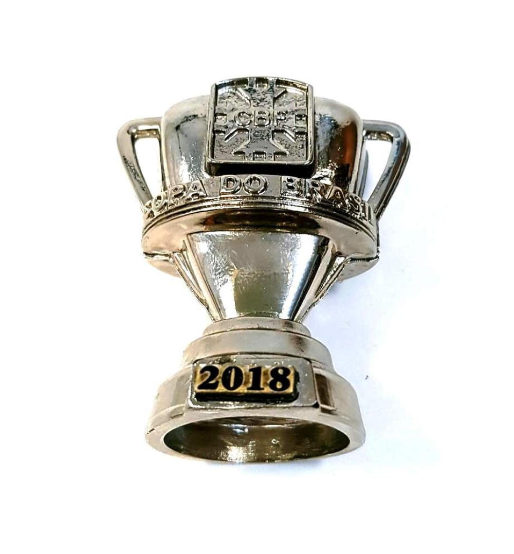 Mini Taça Cruzeiro Hexacampeão Copa do Brasil 2018, um produto fabricado em Metal Fundido com revestimento galvânico em Cromo, com 60 mm de altura.