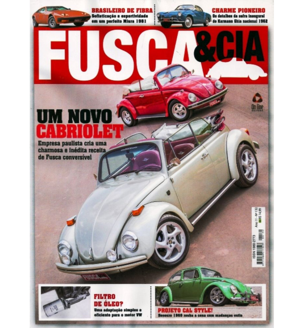 Revista Fusca & Cia N°132 Um Novo Cabriolet, uma publicação que apresenta a criação de uma empresa paulista, uma charmosa e inédita receita de Fusca Conversível e saiba mais, sofisticação e esportividade em um perfeito Miura 1981, os detalhes da safra inaugural do Karmann Ghia nacional 1962, um besouro 1968 projeto Cal Style rouba a cena com mudanças sutils e muito mais.