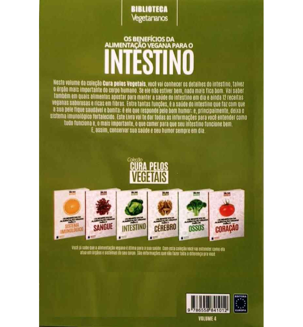 Etiquetas: Livros, Coleção Cura Pelos Vegetais, Vegetarianismo, Biblioteca Natureza e Vegetarianos, Intestino, Alimentação Vegana, Saúde, Alimentos, Receitas Veganas, Receitas Ricas em Fibras, Saúde do Intestino, Pele Saudável, Alimentação Vegetal Natural, Fibras, Livro dos Vegetais, História dos Vegetais, Saúde e Bem Estar, Livro de Saúde, Editora Europa