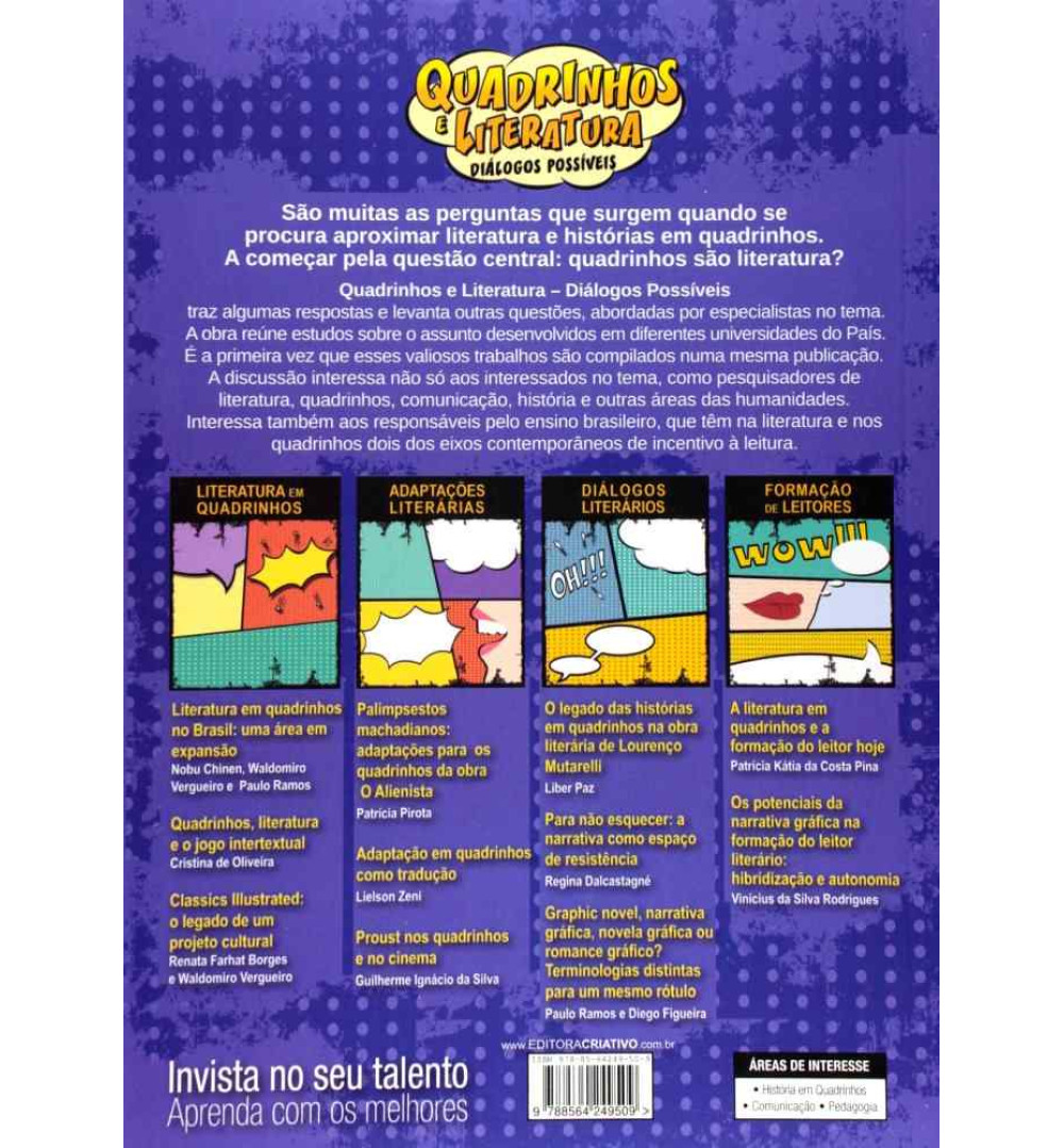 Uma publicação que apresenta onze análises feitas por especialistas em literatura HQs, vinculados a diferentes universidades, respondem se quadrinhos são literatura e como as adaptações de clássicos devem ser analisadas, fazendo um passeio histórico pela temática. Essas e outras questões são respondidas nesta obra, dedicado especificamente ao tema. A proposta central é analisar as fronteiras e os pontos de contato entre as duas linguagens artísticas, passando pelas primeiras adaptações existentes no país, da década de 1930, até a atual inserção de clássicos adaptados no ensino.